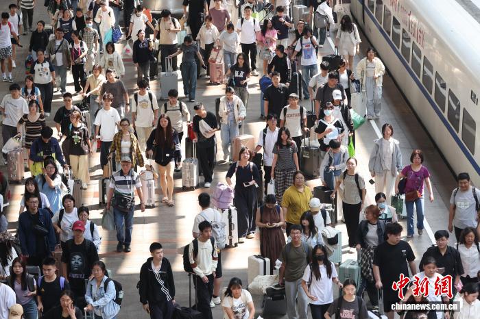 10月8日,江蘇南京,旅客們?cè)诨疖囌境鲂小.?dāng)日是國慶中秋假期最后一天,長三角鐵路迎來返程客流最高峰。中新社記者 泱波 攝