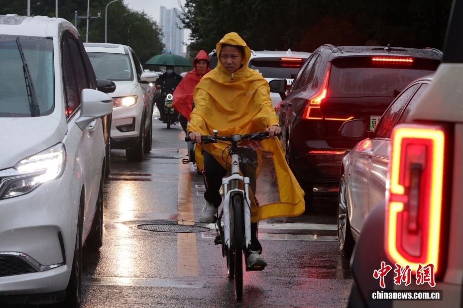 10月9日,北京市通州區(qū),持續(xù)降雨加重了國慶假期后早高峰的擁堵,民眾在雨中趕著通勤通學(xué)。中新社記者 楊可佳 攝