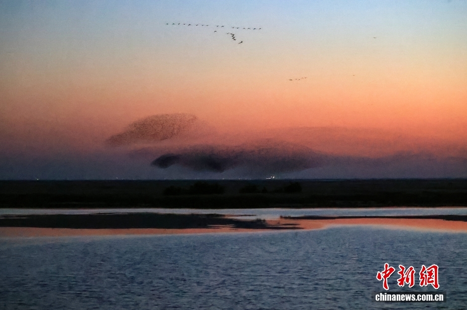 11月19日傍晚,黃河口濕地上空上演鳥浪景觀,讓人嘆為觀止。近日,在位于山東省東營市的山東黃河三角洲國家級自然保護(hù)區(qū)濕地上空,每天都會呈現(xiàn)“鳥浪”壯觀景象。數(shù)萬只花臉鴨騰空飛起,時而扶搖直上,時而俯沖直下,陣型瞬息萬變。