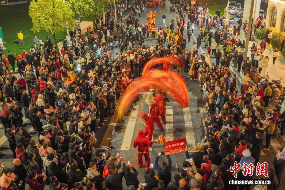 3月2日,元宵節(jié)前夕,“龍騰獅躍”迎新年巡游活動在江西南昌灣里管理局舉行,夜色之中,一條條龍燈、板燈龍翩翩起舞,采蓮船、媒婆、蚌殼精、漁夫、挑花籃、南獅、扇子舞等民俗輪番上演,吸引了眾多民眾沿街觀看。圖為巡游現(xiàn)場,精彩的表演吸引眾多民眾沿街觀看。(無人機(jī)照片)