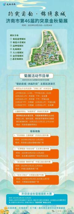 本屆菊展以“趵突菊韻,錦繡泉城”為主題,以趵突泉為核心展地,串聯(lián)五龍?zhí)、大明湖、環(huán)城公園三大園區(qū),形成“一菊連三園”的整體游賞格局,將菊花小景、菊花造型與靈動(dòng)泉水、傳統(tǒng)園林巧妙結(jié)合,配套推出菊花仙子巡游、金秋菊展攝影大賽、游船賞菊專線、趵突菊韻玉露雅集、泉水菊花茶等特色活動(dòng)及產(chǎn)品,構(gòu)建集觀賞、休閑與文化體驗(yàn)于一體的金秋賞菊路線。