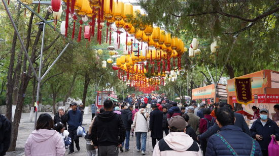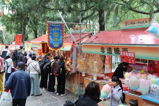 山會市集在正門牌坊至臥佛廣場沿線熱鬧開市,糖畫、面塑、葫蘆烙畫等非遺手造齊聚一堂,菊花茶、泉水茶湯等時令美食香氣四溢,市民游客穿行其間,品味“舌尖上的重陽”,感受濃濃的秋意與地道的老濟南風情。