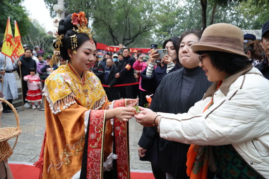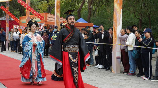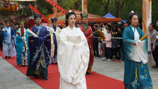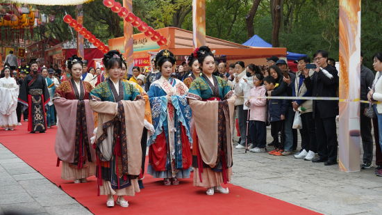 山會首日,千佛山景區(qū)內(nèi)人頭攢動、氣氛熱烈。上午十時,作為開幕重頭戲的“大舜巡游·古禮迎秋”沿主山路盛裝上演。演員身著傳統(tǒng)華服,伴隨韶樂翩躚而行,與沿途游客親切互動,生動再現(xiàn)上古時期“與民同樂、共慶豐收”的歷史盛景,成為山會首日最引人注目的文化風景。
