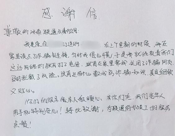 中新網(wǎng)山東新聞10月29日電(張婷婷)“你們的服務(wù)像家人般暖心,有你們?cè)冢覀兝夏耆擞檬謾C(jī)特別安心!”近日,一封手寫(xiě)的感謝信送到了濟(jì)南聯(lián)通。信中詳細(xì)描述了劉阿姨自己在家誤點(diǎn)詐騙鏈接后,在聯(lián)通員工張有幫助下攔截風(fēng)險(xiǎn)的故事。這溫暖的一幕,是山東聯(lián)通服務(wù)老年群體的一個(gè)縮影。在智能化深入日常的今天,讓銀發(fā)一族平穩(wěn)跨越“數(shù)字鴻溝”,已成為重要的社會(huì)課題。