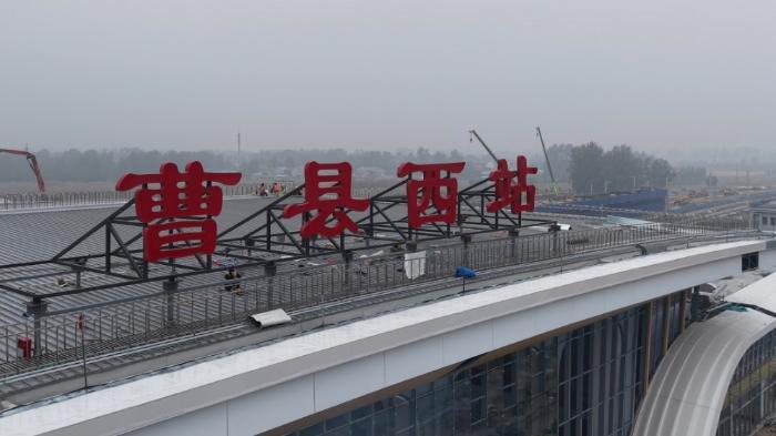 10月28日,隨著“曹縣西站”4個(gè)大字安裝到位,雄商高鐵曹縣西站正式掛牌亮相。曹縣西站位于曹城街道劉六莊村,是雄商高鐵菏澤段兩個(gè)新建車站之一。目前,站房主體結(jié)構(gòu)已全部完成,正在進(jìn)行室內(nèi)裝修、幕墻安裝、廣場(chǎng)和停車場(chǎng)施工作業(yè)。