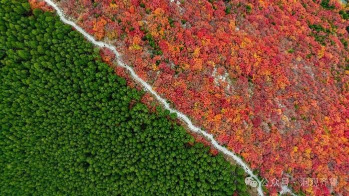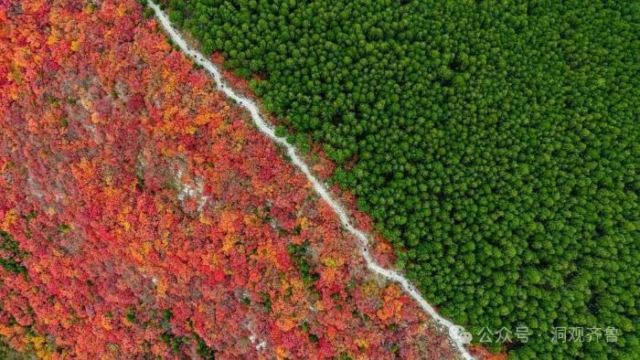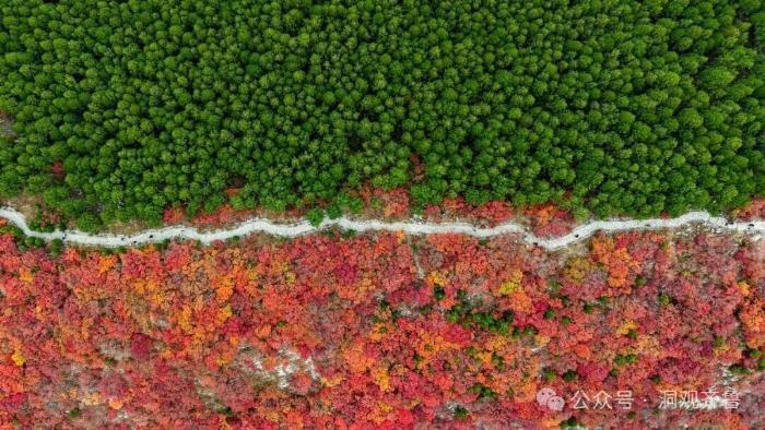 濟(jì)南蝎子山形似翹尾蝎子,靜臥在城市脈絡(luò)中。山脊天然劃界,將秋意一分為二,北坡松柏疊翠,南坡黃櫨燃紅,航拍視角下,蝎子山就像一鍋煮沸的秋日“鴛鴦鍋”,每一幀都是壁紙。
