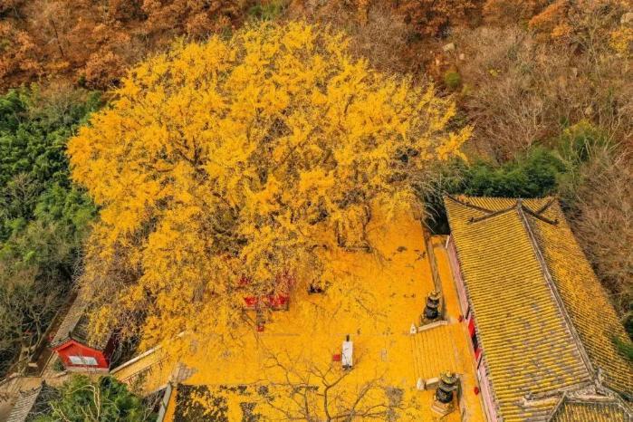 千年古銀杏樹雌雄同體,茂盛的葉子遮天蔽日,秋日站在樹下仰望蒼穹,天地間只剩一片金黃,蔚為壯觀。
