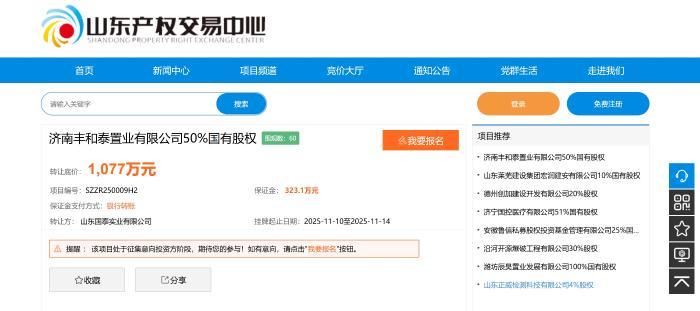 今日,山東國泰實(shí)業(yè)有限公司(下稱“國泰實(shí)業(yè)”)通過山東產(chǎn)權(quán)交易中心,掛牌轉(zhuǎn)讓濟(jì)南豐和泰置業(yè)有限公司(下稱“豐和泰置業(yè)”)50%國有股權(quán),轉(zhuǎn)讓底價(jià)1077萬元,保證金323.1萬元,掛牌起止日期為2025年11月10日至2025年11月14日。