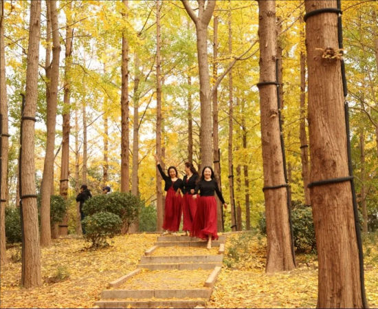 森林公園的銀杏林堪稱“金色童話世界”,成片銀杏樹換上金黃盛裝,陽光灑落滿樹鎏金,落葉鋪就“黃金步道”。市民游客或與親友并肩漫步,或擺姿拍照,歡聲笑語中沉醉于秋日的溫暖治愈。