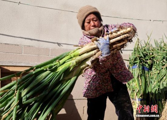 蔥農(nóng)在家門口搬運大蔥,準(zhǔn)備收拾裝箱。 趙曉 攝