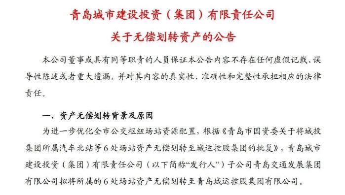 11月17日,青島城市建設(shè)投資(集團)有限責(zé)任公司(下稱“青島城投集團”)發(fā)布無償劃轉(zhuǎn)資產(chǎn)的公告。