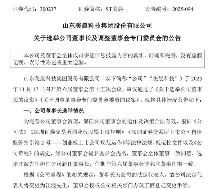 近日,山東美晨科技集團股份有限公司(簡稱“美晨科技”)公告稱,公司召開董事會審議通過了《關于選舉公司董事長的議案》及《關于調(diào)整董事會專門委員會委員的議案》,選舉江波擔任公司新任董事長,對第六屆董事會專門委員會委員進行調(diào)整。
