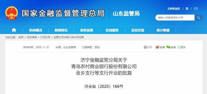 此次獲準開業(yè)的9家支行分別為青島農商銀行金鄉(xiāng)支行、金鄉(xiāng)馬廟支行、金鄉(xiāng)羊山支行、金鄉(xiāng)霄云支行、金鄉(xiāng)凱盛支行、金鄉(xiāng)雞黍支行、金鄉(xiāng)興隆支行、金鄉(xiāng)化雨支行、金鄉(xiāng)司馬支行,相關批復文件的出具時間為2025年11月14日。