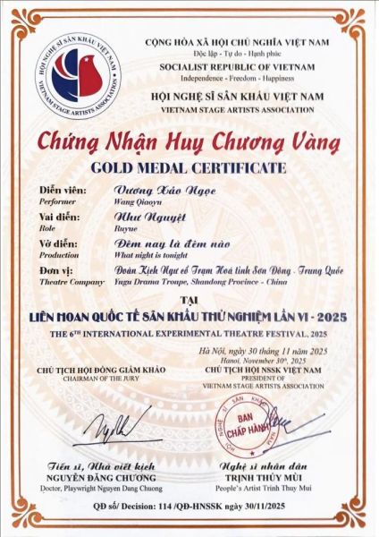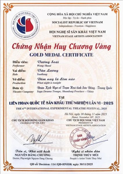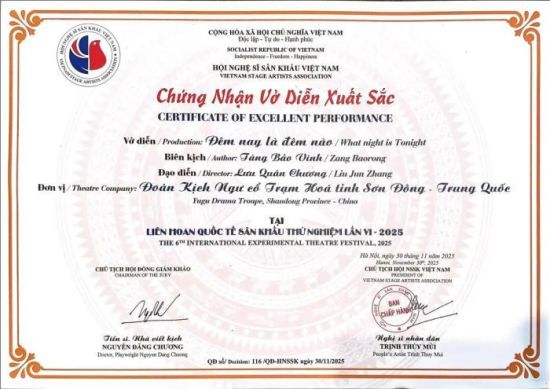 2025年第六屆國際實驗戲劇節(jié)于11月20日至30日在越南寧平舉辦,來自十多個國家的29個劇種劇目入圍最終決賽圈,最終評選出特等獎兩個、一等獎8個。沾化漁鼓戲《今夕何夕》因去年在東盟國際戲劇周的驚艷亮相,成為本屆戲劇節(jié)決賽階段公認(rèn)的種子劇目,最終憑借高藝術(shù)水準(zhǔn)、高觀眾口碑,贏得國際評委團(tuán)和現(xiàn)場觀眾的一致稱贊,斬獲最高獎,成為最大贏家。