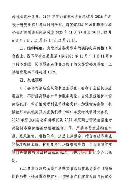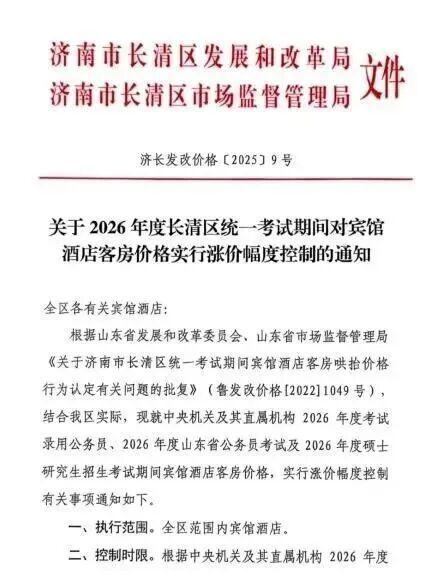 對此,濟南市長清區(qū)市場監(jiān)督管理局工作人員表示,長清大學(xué)城周邊每年考研期間價格漲幅顯著,為此,長清區(qū)發(fā)改委和市場監(jiān)管局已于今年11月26日聯(lián)合印發(fā)《關(guān)于2026年度長清區(qū)統(tǒng)一考試期間對賓館酒店客房價格實行漲價幅度控制的通知》,明確規(guī)定,酒店價格以11月7日至9日同等房型、同等服務(wù)的平均交易價格為基準,上浮幅度不得超過100%。