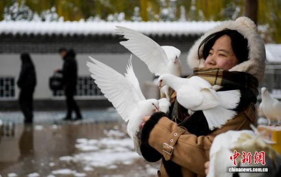 12月13日,濟南泉城廣場,市民在雪景中喂鴿子。雪后,山東省濟南市銀裝素裹,不少市民來到戶外,樂享雪后風光。中新社記者 張勇 攝