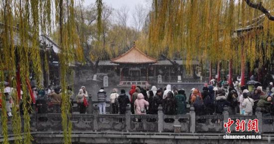 當天中午前后,降雪“派送”至濟南,從零星小雪快速轉(zhuǎn)為紛飛的鵝毛大雪。在濟南市天下第一泉風景區(qū)趵突泉景區(qū),眾多游客冒雪游玩,欣賞氤氳水汽與飛舞雪花交織的泉景。黑虎泉畔,仍有市民堅持冒雪打水。一旁的泉水浴場中,不乏冬泳愛好者破冰暢游的身影。