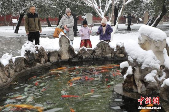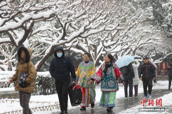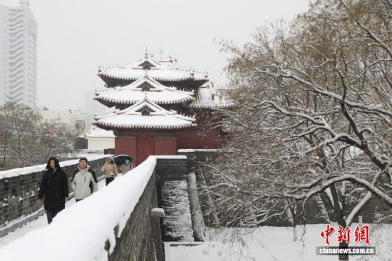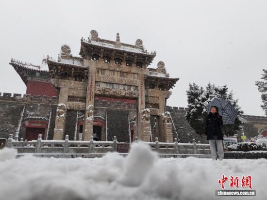12月13日,山東泰安,岱廟銀裝素裹,白雪覆蓋青瓦飛檐,紅墻映雪,吸引游客駐足觀賞。陳陽(yáng) 攝