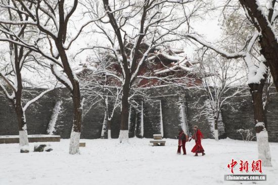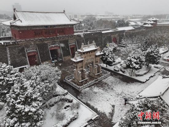 12月13日,山東泰安,岱廟銀裝素裹,白雪覆蓋青瓦飛檐,紅墻映雪,古建更顯雅致。陳陽(yáng) 攝