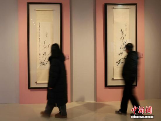 觀眾在展廳內(nèi)欣賞齊白石創(chuàng)作的《劉海戲蟾》《無量壽佛》等作品。趙曉 攝