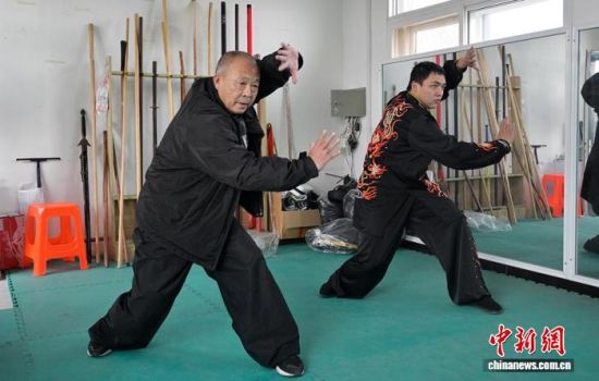 12月2日,山東萊陽(yáng),李飛林(左)向徒弟傳授螳螂拳實(shí)戰(zhàn)招式。劉昊 攝