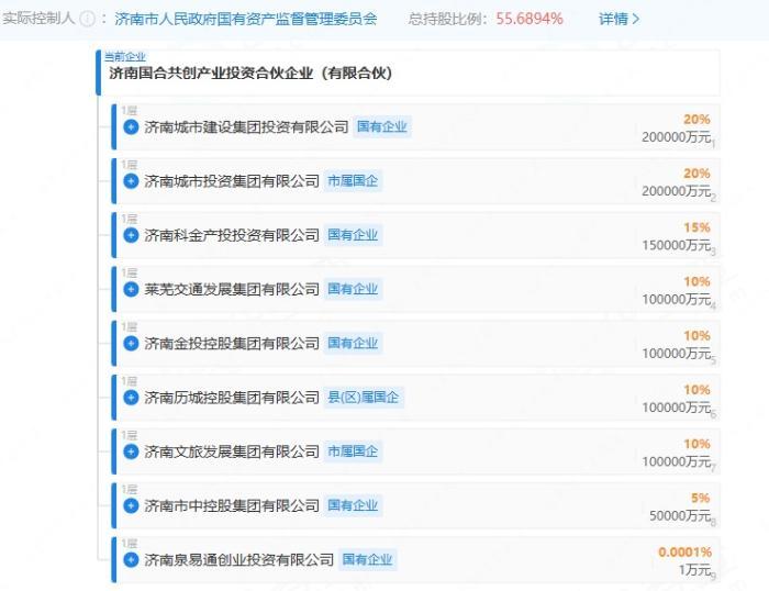 企查查信息顯示,濟(jì)南市屬國(guó)企、縣(區(qū))國(guó)企等9家企業(yè)為合伙人,實(shí)控人為濟(jì)南市國(guó)資委。其中,濟(jì)南城市建設(shè)集團(tuán)投資有限公司、濟(jì)南城市投資集團(tuán)有限公司出資比例為20%,濟(jì)南科金產(chǎn)投投資有限公司出資15%,萊蕪交通發(fā)展集團(tuán)有限公司、濟(jì)南金投控股集團(tuán)有限公司、濟(jì)南歷城控股集團(tuán)有限公司、濟(jì)南文旅發(fā)展集團(tuán)有限公司各出資10%,濟(jì)南市中控股集團(tuán)有限公司出資5%,濟(jì)南泉易通創(chuàng)業(yè)投資有限公司出資比例為0.0001%。