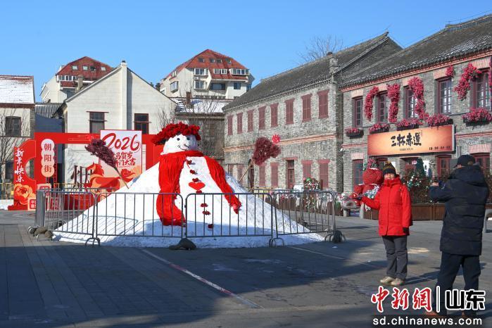 1月12日,在雪后的煙臺(tái)朝陽街景區(qū)和煙臺(tái)山景區(qū),游客們一起堆雪人,并和雪人拍照留影。