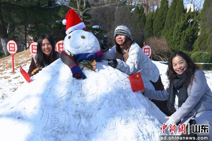 圖為游客在煙臺(tái)山景區(qū)內(nèi)堆雪人。曲正揚(yáng) 攝