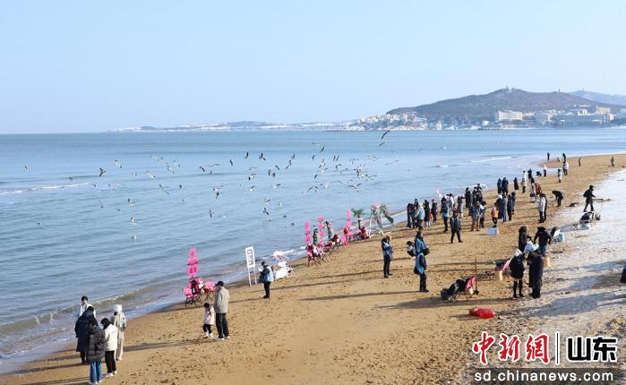 威海國際海水浴場一改夏日的喧囂,盡顯冬日特有的遼闊與純凈。沙灘上鋪著一層薄薄的白雪,與蔚藍海水形成鮮明對比,遠處海鷗盤旋于雪海之間。不少游客沿著海岸線漫步,感受冬日海濱的清新與寧靜。金海灘棧橋上,強風裹挾海水拍擊棧橋鐵鏈,凝結(jié)成晶瑩冰掛。人們憑欄遠眺,雪中海灣景色盡收眼底,海天一色的景象令人心曠神怡。