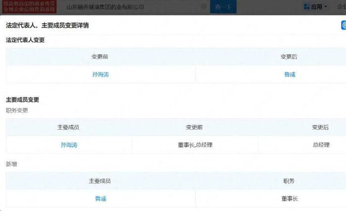 企查查顯示,日前,山東頤養(yǎng)健康集團藥業(yè)有限公司(下稱“山東頤養(yǎng)健康藥業(yè)”)發(fā)生工商變更,魯彧接替孫海濤就任公司法定代表人及董事長。目前,孫海濤依然擔任公司總經理。