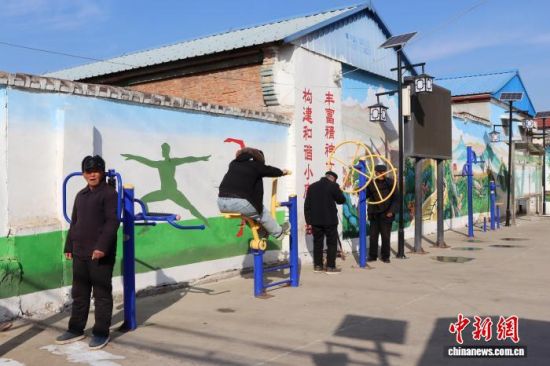 在鄆城縣楊莊集鎮(zhèn)袁屯村廣場,村民在使用健身器材鍛煉。鄆城縣委宣傳部供圖