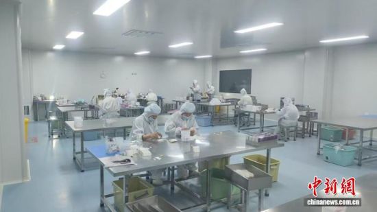 在菏澤市單縣一家醫(yī)療用品公司,工人們身著無菌工裝專注操作。單縣縣委宣傳部供圖