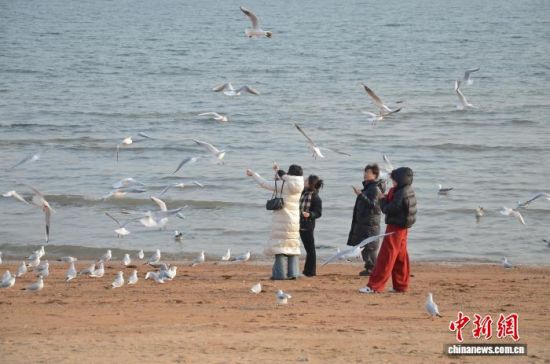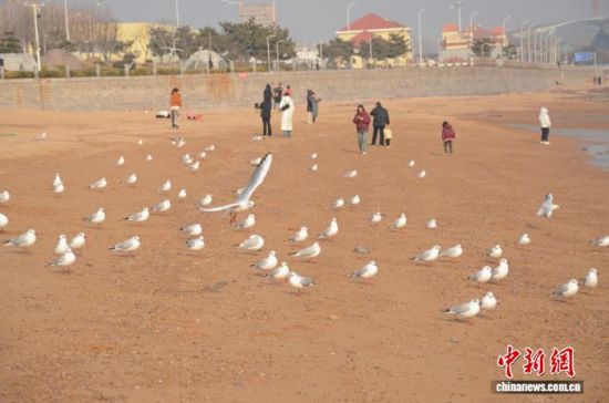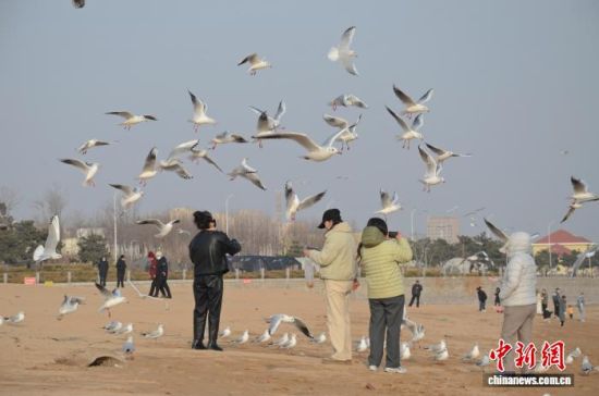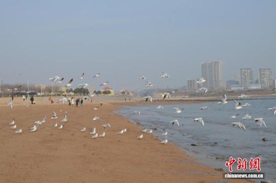 山東青島:靈山灣畔海鷗翔集 人鷗互動(dòng)共舞海天