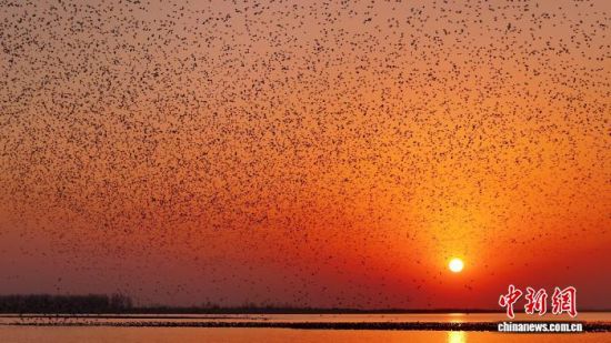 2025年11月25日,山東黃河三角洲國(guó)家級(jí)自然保護(hù)區(qū)的“鳥(niǎo)浪”奇觀。楊斌 攝