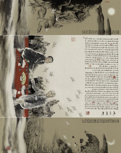 其二,該組畫選了四個關鍵歷史時刻,并以精湛的藝術駕馭力完成了視覺轉化,實現(xiàn)了宏大歷史主題的審美升華與詩意呈現(xiàn)。專家認為,四幅作品緊緊圍繞“傳薪”展開,敘事脈絡清晰,但藝術家針對四個不同的歷史情境,藝術處理手法各有不同 卻又各有巧思:《天下歸心》創(chuàng)新引入大篇幅宋體書法跋文并14位民主人士簽名活躍畫面,將歷史文獻的莊重感轉化為別具的視覺形式語言;《北上》匠心獨運,以“巨輪”為核心意象構建畫面,將人物的歷史抉擇置于波濤云海之間,用象征手法營造出恢宏的歷史動勢與空間史詩感;《共商國事》巧妙運用“以小見大”的敘事智慧,聚焦于“設計國徽”這一具體場景,折射出開國建制的宏大主題;《九二共識》則精心營造意境與象征表達,通過山水相連、血脈相通的自然元素構圖,喻示了海峽兩岸不可分割的中華民族共同體意識。