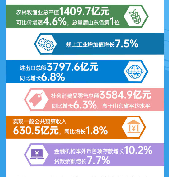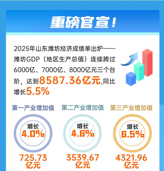 中新網(wǎng)山東新聞2月4日電(沈廣安)2月3日,2025年山東濰坊經(jīng)濟(jì)“成績單”出爐。濰坊GDP(地區(qū)生產(chǎn)總值)連續(xù)跨過6000億、7000億、8000億元三個臺階,達(dá)到8587.36億元,同比增長5.5%。其中,規(guī)模以上工業(yè)增加值同比增長7.5%;金融機(jī)構(gòu)本外幣各項存款、貸款余額分別增長10.2%和7.7%;居民人均可支配收入45794元,同比增長4.6%。下面,一圖讀懂濰坊8587.36億GDP背后的“質(zhì)”變底氣。