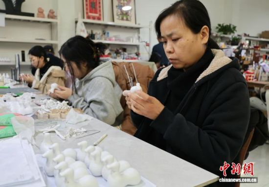 圖為工作人員在用軟陶捏制“馬彪彪”。趙曉 攝