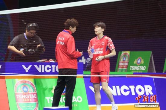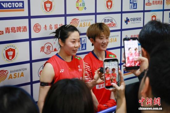 圖為中國(guó)羽毛球女隊(duì)賈一凡/張殊賢組合在賽后接受采訪。張孝鵬 攝