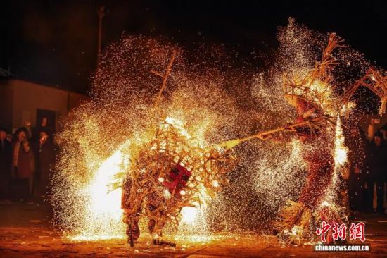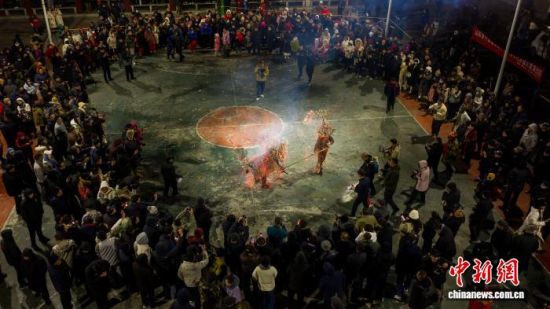 中新網(wǎng)山東鄒城2月5日電(沙見龍 宋文強(qiáng))“開門放虎!”夜幕降臨,隨著廣場燈光驟然熄滅,密集的鑼鼓聲響起。一名身負(fù)特制“火甲”的表演者踩上高蹺,周身瞬間迸發(fā)出數(shù)千條金色火線,宛如猛虎現(xiàn)身。與之對峙的“打虎人”手持火捻哨棒,騰挪撲閃間,火星如瀑流瀉,照亮夜空。