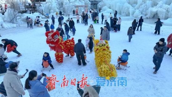 冬日的九如山,白雪覆嶺、冰瀑凝玉,紅彤彤的燈籠點綴其間,將新春的喜慶氛圍拉滿;顒蝇F(xiàn)場暖意融融,海外友人們剛踏入景區(qū),便被熱鬧喜慶的舞獅表演深深吸引。鏗鏘有力的鑼鼓聲響起,金黃與艷紅相間的獅身騰躍翻轉(zhuǎn)、靈動俏皮,將新春的吉祥寓意與中式喜慶演繹得淋漓盡致。友人們紛紛駐足觀賞,舉起相機定格這極具中國特色的年味瞬間。
