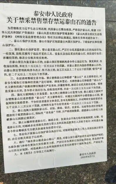 在泰山腳下買的工藝品石頭,為何也成了“禁寄品”?這并非快遞小哥“不愿寄”,而是嚴(yán)格執(zhí)行當(dāng)?shù)氐姆煞ㄒ?guī)。媒體查詢發(fā)現(xiàn),2025年9月7日,泰安市人民政府曾發(fā)布一則《關(guān)于禁采禁售禁存禁運(yùn)泰山石的通告》。