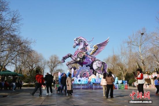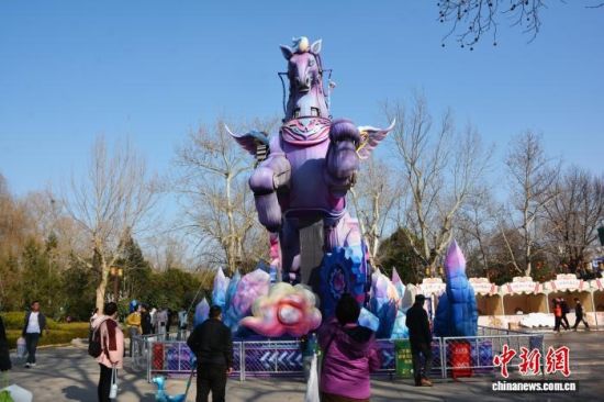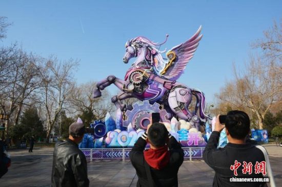 2月14日,山東濟(jì)南大明湖景區(qū),生肖馬主題大型花燈吸引了眾多游客駐足觀賞、拍照打卡。中新社記者 呂妍 攝