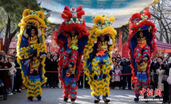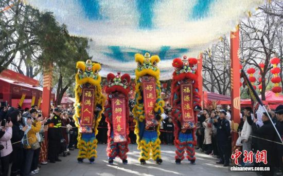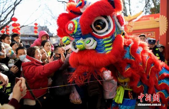 2月17日,濟(jì)南千佛山游園會(huì),游客觀看舞獅表演。當(dāng)日是正月初一,山東濟(jì)南千佛山游園會(huì)、明湖市集等迎新春活動(dòng)火爆開(kāi)場(chǎng),人們逛廟會(huì)、賞年俗、慶團(tuán)圓,歡歡喜喜過(guò)大年。中新社記者 張勇 攝