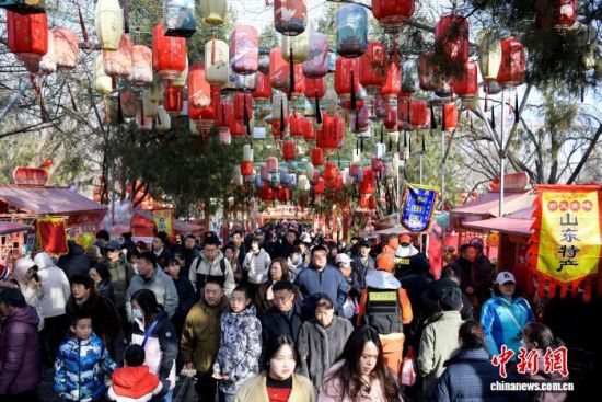 2月17日,濟(jì)南千佛山游園會(huì),游客登山賞年俗。當(dāng)日是正月初一,山東濟(jì)南千佛山游園會(huì)、明湖市集等迎新春活動(dòng)火爆開(kāi)場(chǎng),人們逛廟會(huì)、賞年俗、慶團(tuán)圓,歡歡喜喜過(guò)大年。中新社記者 張勇 攝