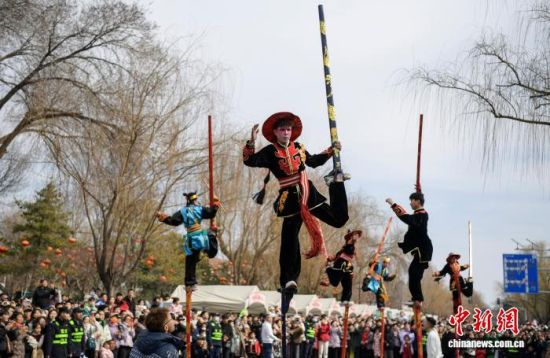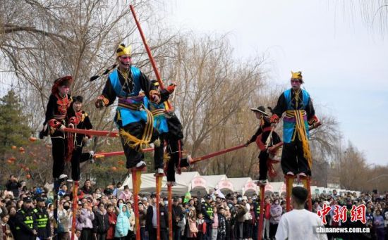 2月17日,游客在濟(jì)南明湖市集上觀看高蹺表演。當(dāng)日是正月初一,山東濟(jì)南千佛山游園會(huì)、明湖市集等迎新春活動(dòng)火爆開(kāi)場(chǎng),人們逛廟會(huì)、賞年俗、慶團(tuán)圓,歡歡喜喜過(guò)大年。中新社記者 張勇 攝