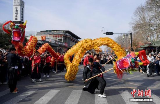2月17日,游客在濟(jì)南明湖市集上觀看舞龍表演。當(dāng)日是正月初一,山東濟(jì)南千佛山游園會(huì)、明湖市集等迎新春活動(dòng)火爆開(kāi)場(chǎng),人們逛廟會(huì)、賞年俗、慶團(tuán)圓,歡歡喜喜過(guò)大年。中新社記者 張勇 攝