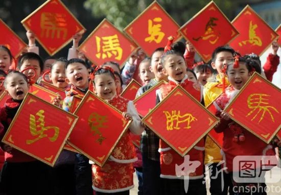 江西省九江市九江小學(xué)的學(xué)生們正在展示自己的馬字剪紙作品。(資料圖)中新社發(fā) 胡國林 攝