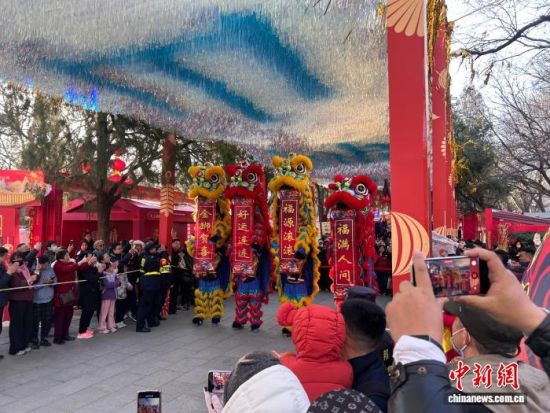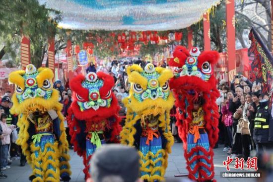 2月17日,大年初一,濟(jì)南千佛山新春游園會(huì)熱鬧開(kāi)場(chǎng),舞獅表演、新年大集等吸引民眾登山游玩。圖為四頭金紅相間的雄獅搖頭擺尾,為民眾送上新春祝福。馬劍 攝