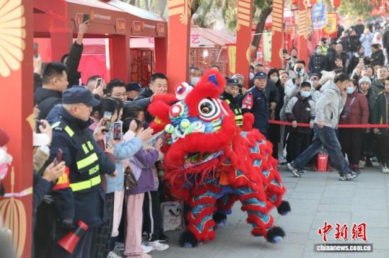 2月17日,大年初一,濟(jì)南千佛山新春游園會(huì)熱鬧開(kāi)場(chǎng),舞獅表演、新年大集等吸引民眾登山游玩。圖為四頭金紅相間的雄獅騰挪跳躍、搖頭擺尾,上演吐福送福、巡游互動(dòng)等表演。馬劍 攝