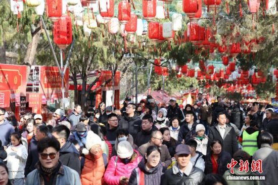 2月17日,大年初一,濟(jì)南千佛山新春游園會(huì)熱鬧開(kāi)場(chǎng),舞獅表演、新年大集等吸引民眾登山游玩。圖為民眾登爬千佛山,游逛新年大集。馬劍 攝
